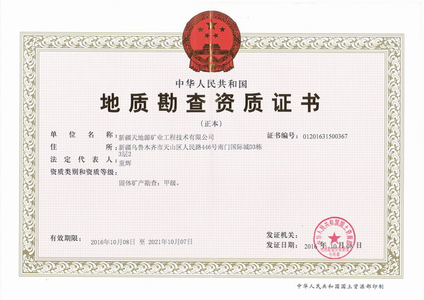 新疆天地源地勘公司成立于2004年,歷經(jīng)十余年的發(fā)展,現(xiàn)持有地質(zhì)勘查甲級資質(zhì)和ISO9001:2008質(zhì)量管理體系認(rèn)證證書。